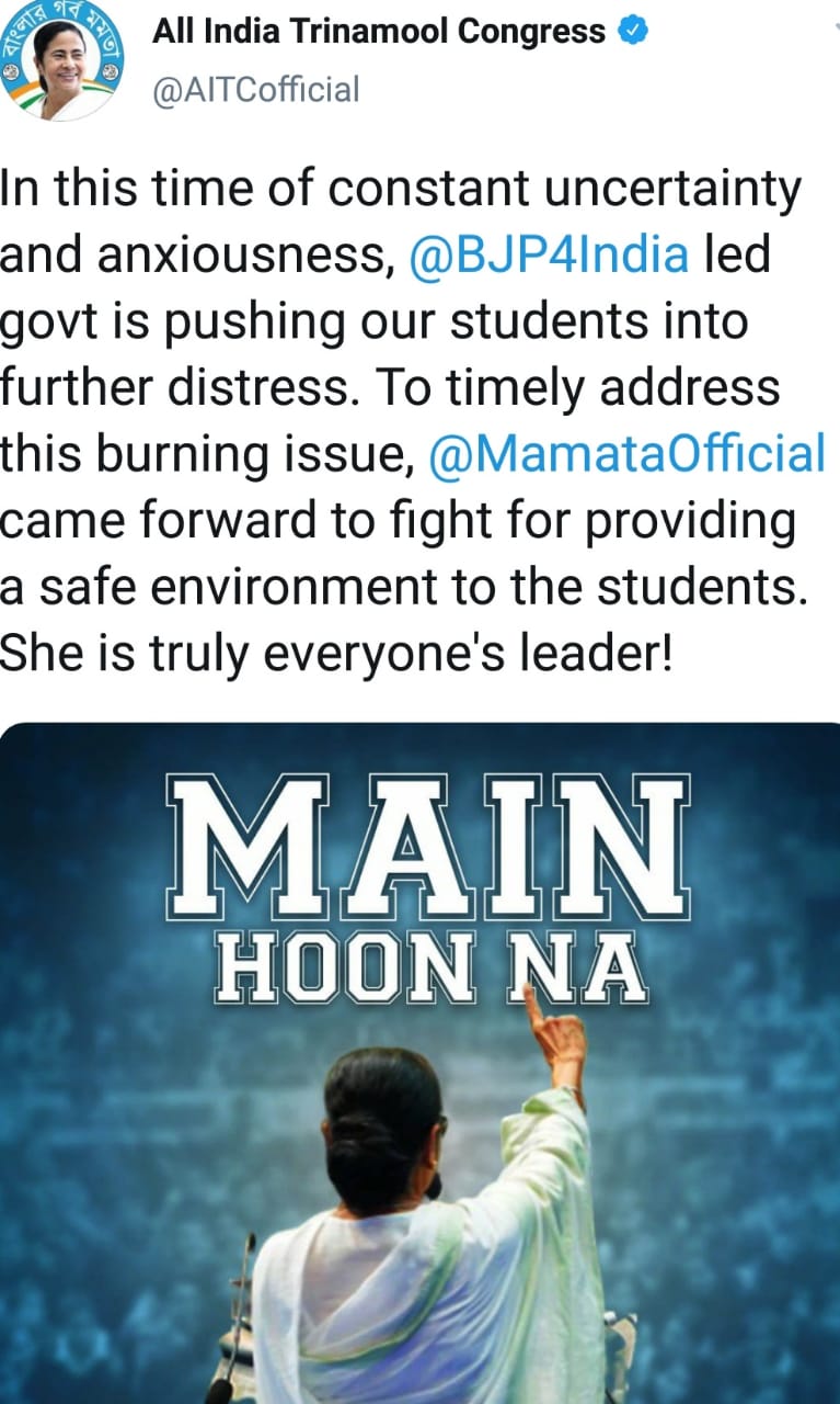 এক টুইটে পোস্ট করা হয়েছে অল ইন্ডিয়া তৃণমূল কংগ্রেসের পক্ষ থেকে। সেখানে দলনেত্রীর একটি ছবি পোস্ট করে তারা লিখেছে “ম্যায় হুঁ না”। করোনা সঙ্কটে লেখা হয়েছে গভীর এক অনিশ্চয়তা ও উৎকন্ঠার মধ্যে দিয়ে যাচ্ছে গোটা দেশ। এরকম এক সময়ে দেশের লক্ষ লক্ষ মেধাবী পড়ুয়া, যাঁরা দেশের ভবিষ্যৎ, তাঁদের আরও বিপদের মুখে ঠেলে দিচ্ছে বিজেপি শাসিত কেন্দ্রীয় সরকার। এরকম এক ইস্যুতে পড়ুয়াদের নিরাপত্তার স্বার্থে সরব মমতা বন্দ্যোপাধ্যায়।