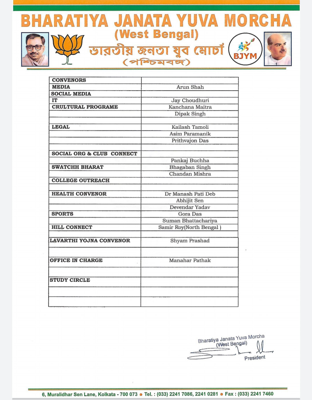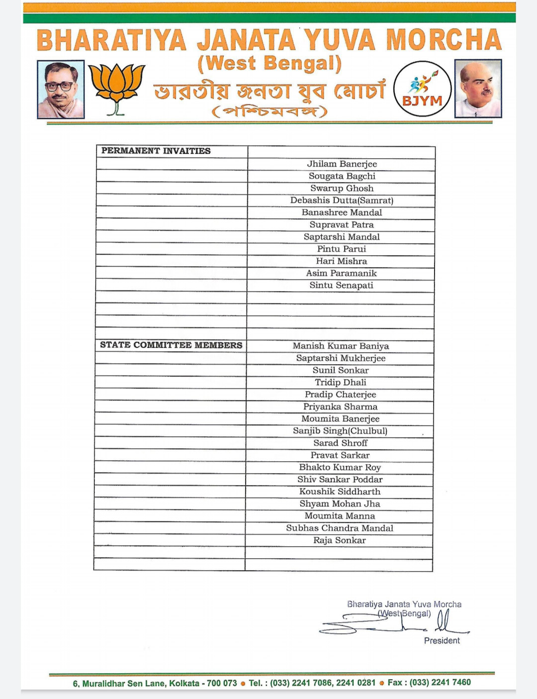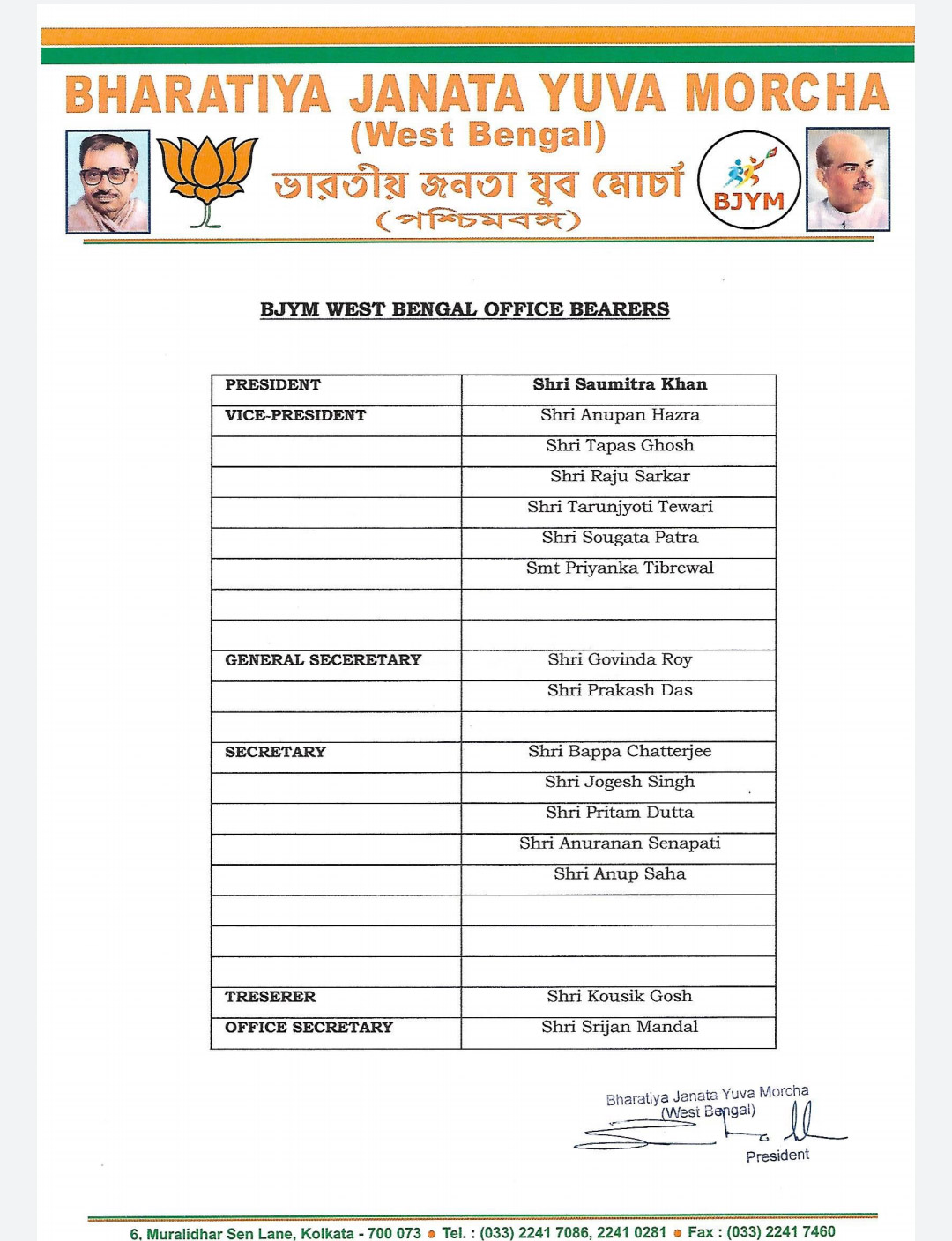 এদিন যুব মোর্চার নতুন রাজ্য কমিটিও ঘোষণা করেন সৌমিত্র খাঁ। রাজ্য কমিটিতে সহ-সভাপতি পদে আনা হয়েছে বোলপুরের প্রাক্তন সাংসদ অনুপম হাজরাকে৷ আইনজীবী প্রিয়াঙ্কা টিবরেওয়ালও পদ পেয়েছেন৷