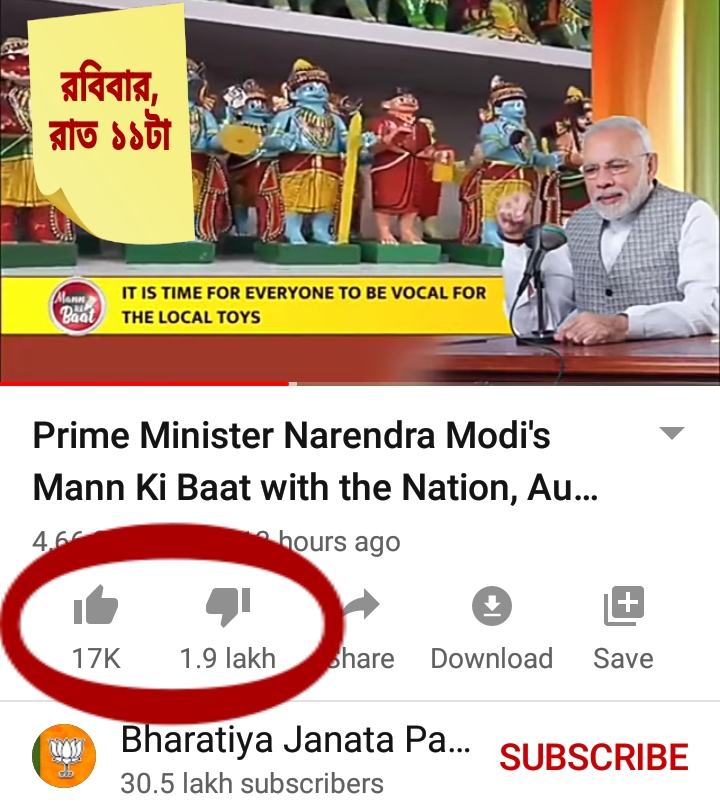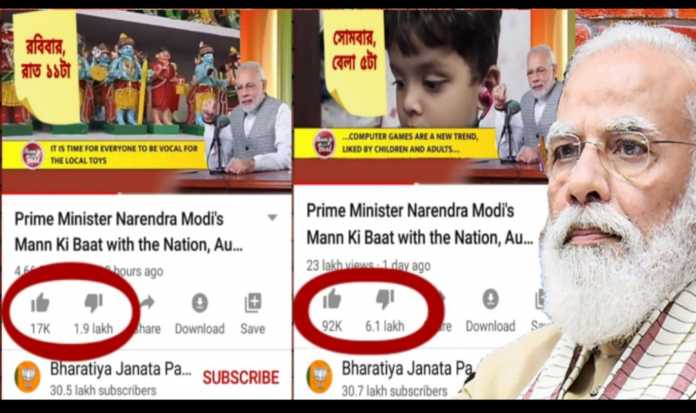 রবিবার রাত ১২টা পর্যন্ত বিজেপির অফিসিয়াল ইউটিউব চ্যানেলে শেয়ার করা ‘মন কি বাত’-এ লাইক করেছেন ১৭ হাজার ( 17K) মানুষ, আর ডিসলাইক অর্থাৎ অপছন্দ করেছেন ১.৯ লক্ষ ( 1.9 lakh) মানুষ। যা বিজেপির কপালের ভাঁজ বাড়াতে যথেষ্ট। আর সোমবার সব রেকর্ড ভেঙ্গে ডিসলাইক দাঁড়ায় 6.1 লক্ষে৷