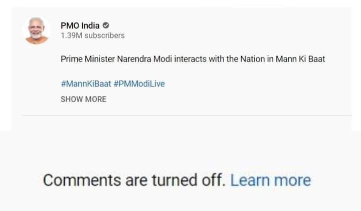 পরিস্থিতি যাচ্ছেতাই রকমের লজ্জাজনক হয়ে উঠছে দেখে ‘স্যর’-কে বাঁচাতে সক্রিয় হতে হলো PMO-কে৷ সোমবার একটু বেলার দিকে PMO আধিকারিকরা মোদিজির বড় সাধের “মন কি বাত “- এর কমেন্টস সেকশন-ই লক করে দিলো৷ নে, আর কোথায় ‘ডিসলাইক’ করবি, কর ৷