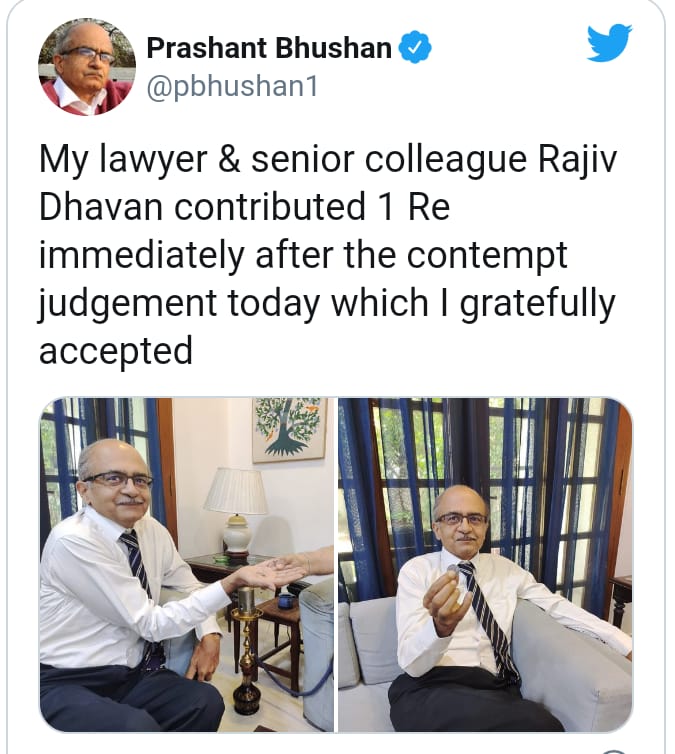 দু’টি টুইটের মাধ্যমে আদালত অবমাননা করার শাস্তি হিসেবে এ দিনই প্রশান্ত ভূষণকে ১ টাকা জরিমানা করে সুপ্রিম কোর্ট৷ রায়ে বলা হয়, জরিমানা না দিলে তাঁর ৩ মাসের জেল এবং ৩ বছরের জন্য প্রশান্ত ভূষণ আইনজীবী হিসেবে প্র্যাক্টিস করতে পারবেন না৷