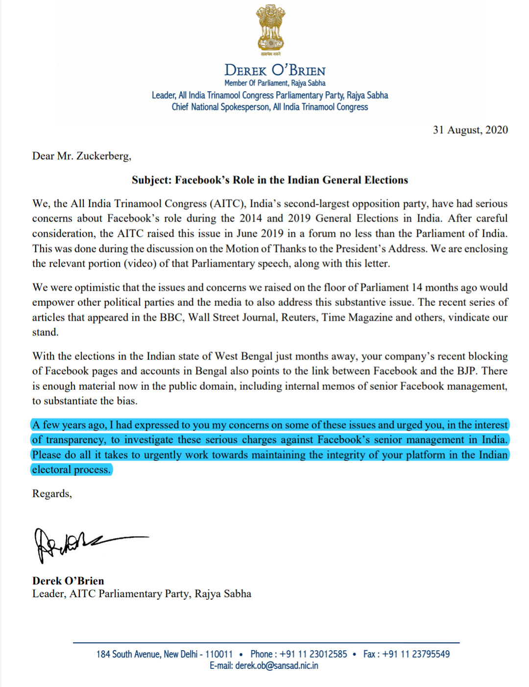 দেশের নির্বাচন প্রক্রিয়াকে প্রভাবিত করতে চাইছে ফেসবুক। বিজেপির সঙ্গে আঁতাত করে পশ্চিমবঙ্গে নির্বাচনের আগে ফেসবুকের পেজ বা ওয়াল থেকে বিজেপি বিরোধী পোস্ট ডিলিট করা হচ্ছে। অভিযোগ তুলে জুকারবার্গকে চিঠি লিখলেন তৃণমূল সাংসদ ডেরেক ও’ব্রায়েন।