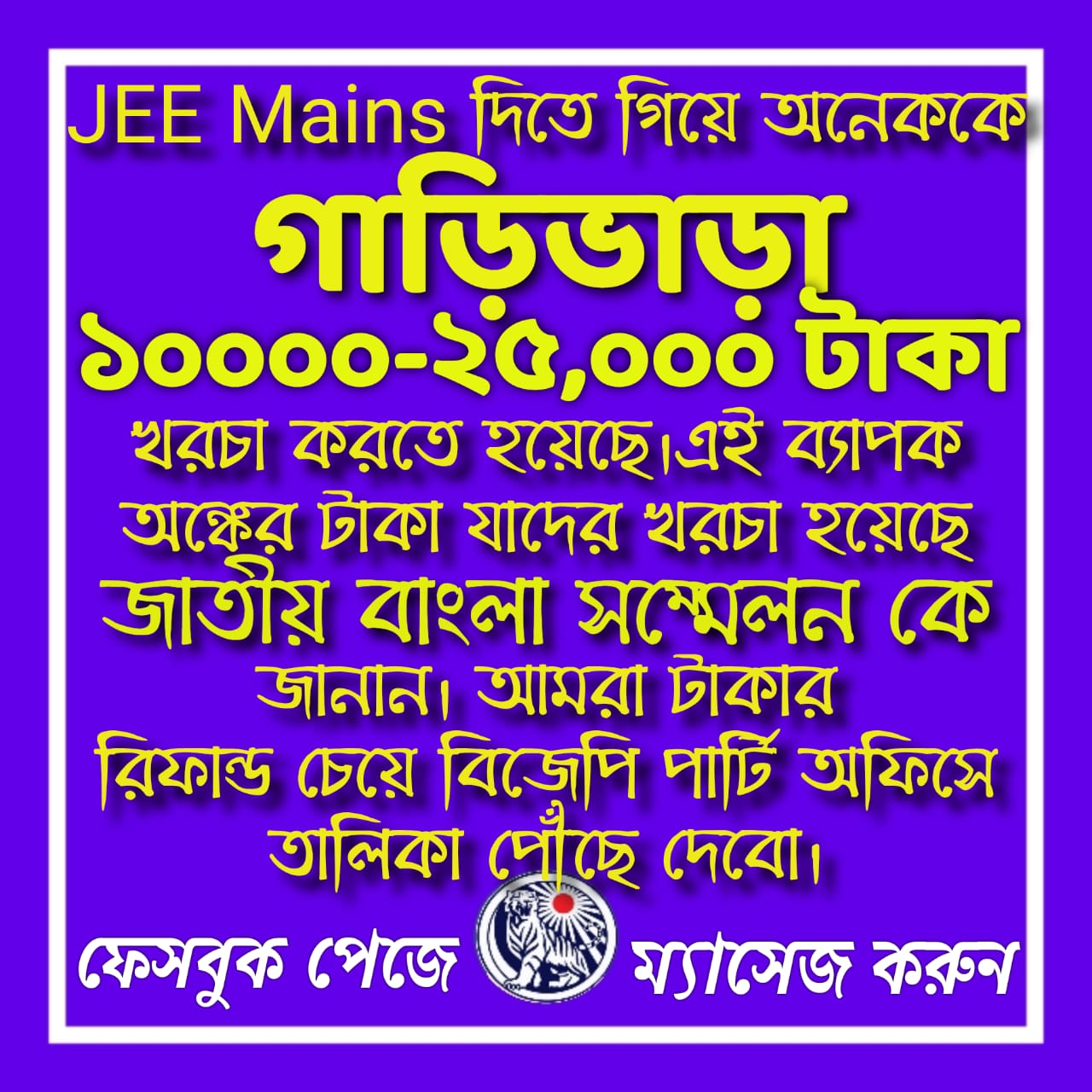 জাতীয় বাংলা সম্মেলনের সাধারণ সম্পাদক আরও বলেন, “অতিমারির পরিস্থিতিতে পরীক্ষার্থীদের অসুবিধা বিবেচনা না করেই পরীক্ষায় অনড় থাকল কেন্দ্র। যাতায়াতের বিষয়টি তারা রাজ্য সরকারের সঙ্গে আলোচনাও করেনি। পরীক্ষাকেন্দ্রে পৌঁছাতে পড়ুয়াদের অতিরিক্ত ভাড়ার মুখে পড়ার বিষয়টিও তাই তাদের দেখা উচিত। এই বিষয়টি মাথায় রেখে পরীক্ষার্থীদের ভাড়ার টাকা ফিরিয়ে দেওয়ার দাবিতে এই কর্মসূচি নিয়েছে আমরা ।”