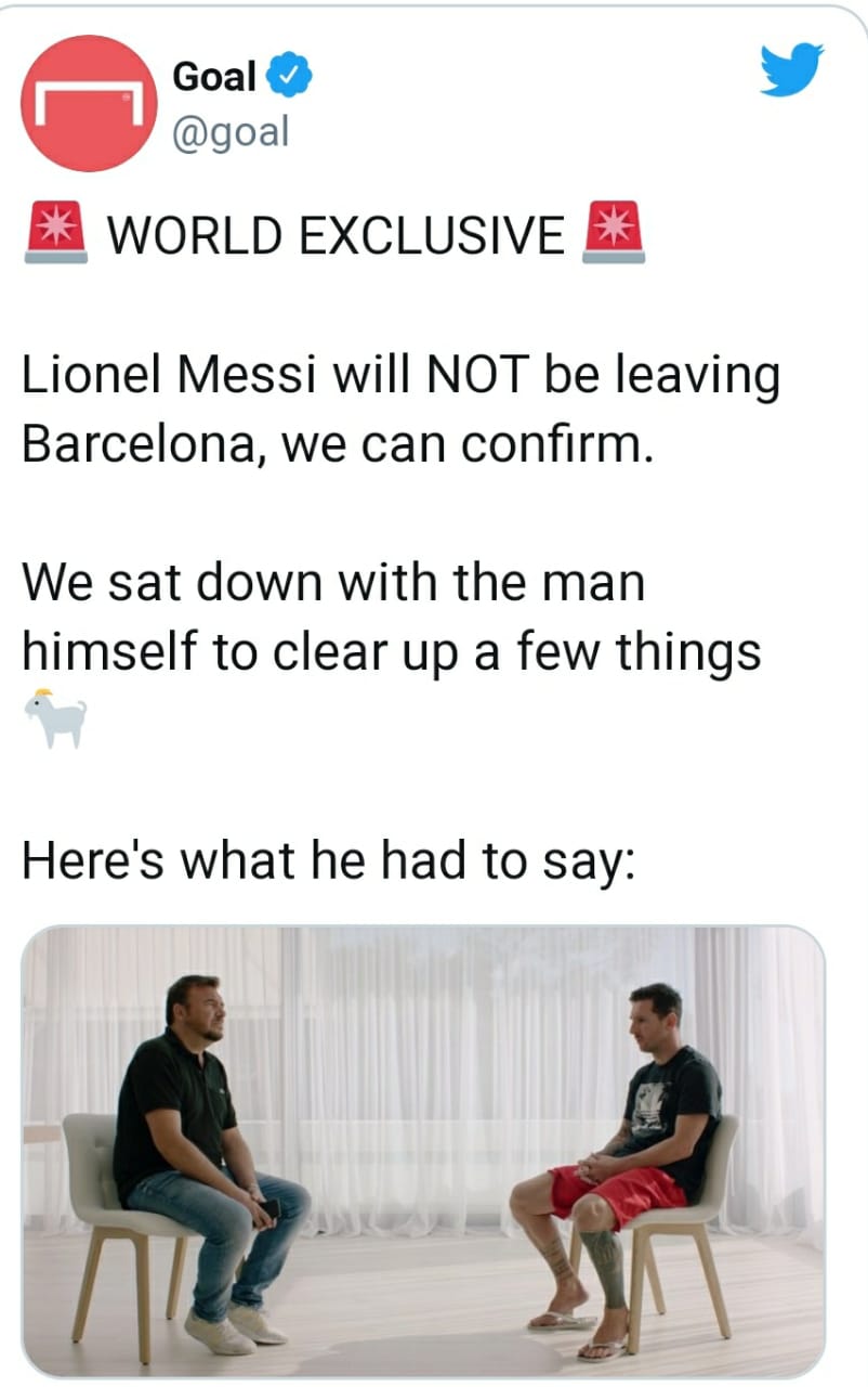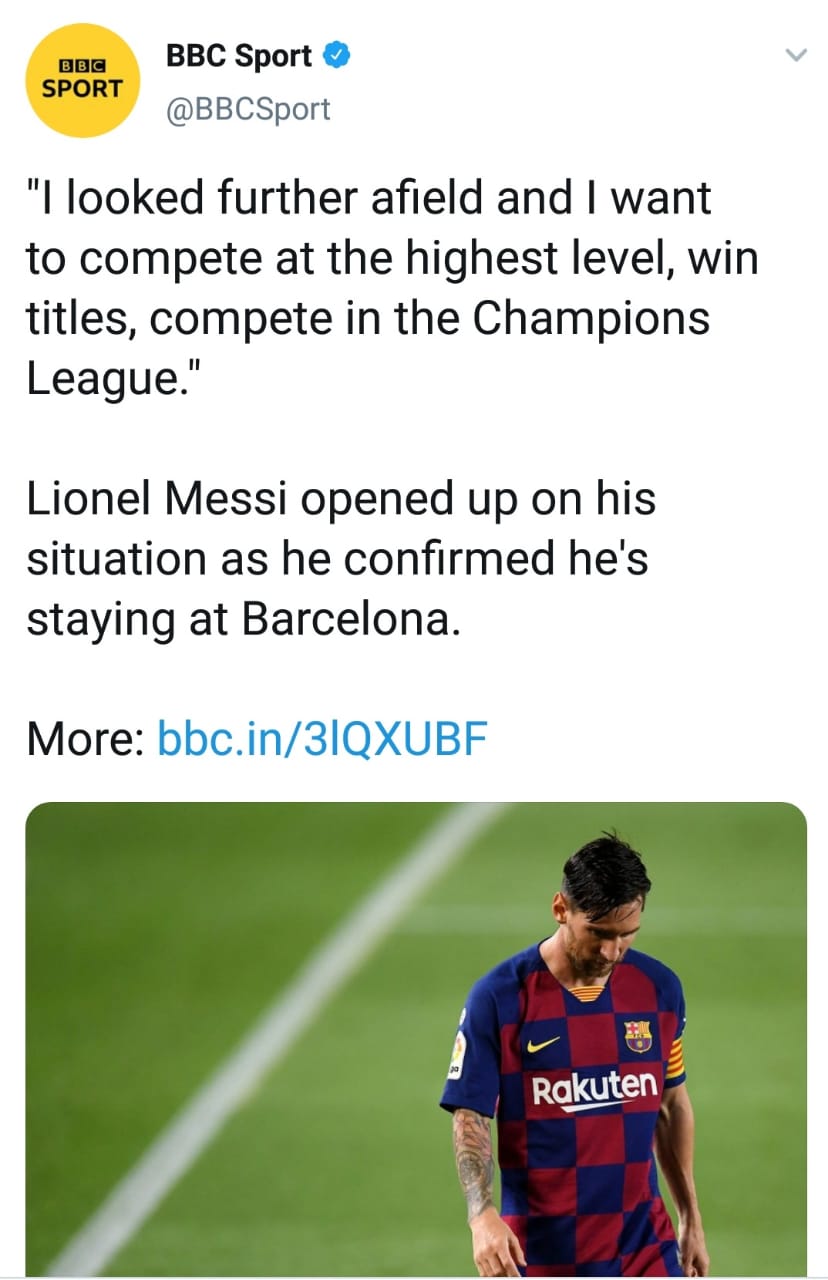 তবে চুক্তির কারণে শুরু থেকেই ব্যাকফুটেই ছিলেন মেসি। অবশেষে লা লিগা চুক্তির শর্ত বুঝতে ভুল করেছেন জানিয়ে বিবৃতি দেন মেসি। চাইলে বিনা ট্রান্সফার ফিতেই যেতে পারেন বলে দাবি তিনি। অবশেষে বার্সেলোনাতেই থাকবেন বলে আনুষ্ঠানিক ঘোষণা করলেন মেসি। এবং স্পষ্ট জানালেন, ইচ্ছার বিরুদ্ধেই বার্সাতে থাকতে হচ্ছে তাঁকে। চাইলে আইনি সহায়তা নিয়ে ক্লাব ছাড়তে পারতেন কিন্তু বর্তমান বোর্ডের সঙ্গে এমন দ্বন্দ্বে জড়িয়ে প্রিয় ক্লাবের সঙ্গে সম্পর্ক খারাপ করতে নারাজ তিনি। এই ক্লাব থেকেই তো তাঁর মেসি হয়ে ওঠা!
