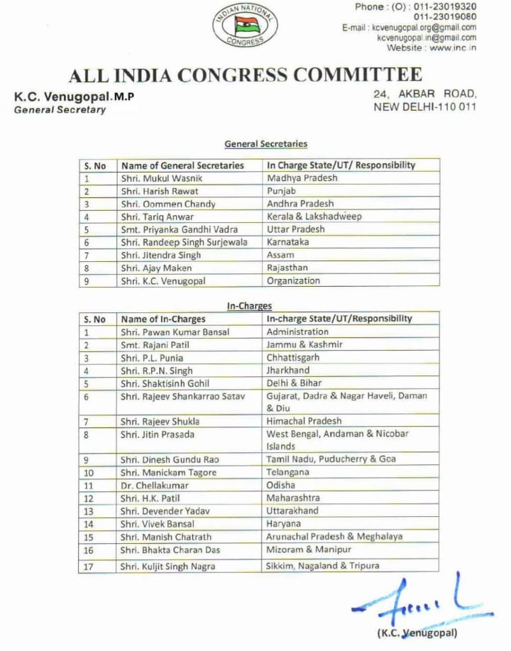 রদবদলের পর দলের চিত্র এইরকম, প্রিয়াঙ্কা গান্ধী উত্তর প্রদেশের দায়িত্বে৷ রাহুল গান্ধীর অনুগত মানিকাম ঠাকুর তেলেঙ্গানার দায়িত্বে৷ হরিশ রাওয়াত পাঞ্জাবের দায়িত্বপ্রাপ্ত সাধারণ সম্পাদক৷ তারিক আনোয়ার কেরালা ও লাক্ষাদ্বীপের দায়িত্বে৷ জিতেন্দ্র সিং অসম এবং ওমেন চান্ডি অন্ধ্রপ্রদেশের দায়িত্বে এলেন।