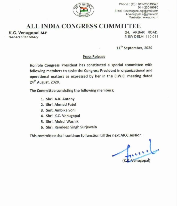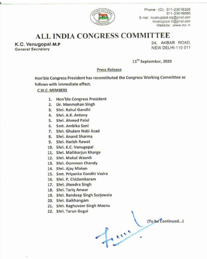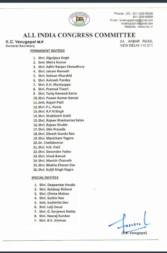 কংগ্রেস ওয়ার্কিং কমিটি বা CWC-র নতুন সদস্য হলেন দিগ্বিজয় সিং, রাজীব শুক্লা, মানিককাম ঠাকুর, প্রমোদ তিওয়ারি, জয়রাম রমেশ, এইচ কে পাতিল, সালমান খুরশিদ, পবন বনশল, দীনেশ গুন্ডুরাও, মণীশ চাত্রাথ এবং কুলজিৎ নাগরা।