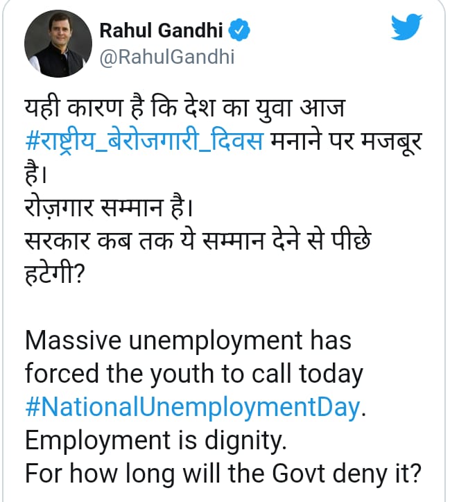 কর্মসংস্থানকে হাতিয়ার করেই বৃহস্পতিবার নরেন্দ্র মোদিকে নিশানা করে কংগ্রেস। একটি সংবাদপত্রে প্রকাশিত এক সংবাদের অংশ দিয়ে রাহুল গান্ধী টুইট করেছেন,”চরম বেকারত্বের জন্য দেশের যুবা আজ #राष्ट्रीय_बेरोजगारी_दिवस পালন করতে বাধ্য হচ্ছে।”