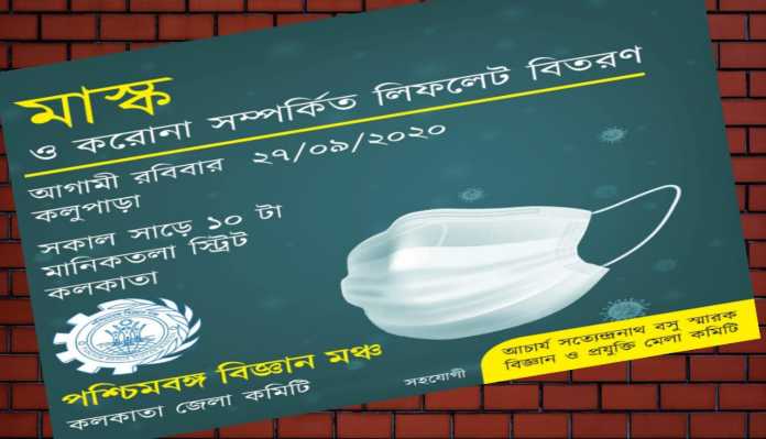 মহামারি আবহে মাস্ক কেন বাধ্যতামূলক, সাধারণ মানুষের কাছে তা তুলে ধরার এক কর্মসূচি নিয়েছে পশ্চিমবঙ্গ বিজ্ঞান মঞ্চের কলকাতা জেলা কমিটি৷ একইসঙ্গে করোনা-সম্পর্কিত আতঙ্ক দূর করে, আক্রান্ত হলে ঠিক কী করা উচিত, তাও বোঝানো হবে৷ আগামী ২৪ সেপ্টেম্বর, বৃহস্পতিবার সন্ধ্যা ৬টা নাগাদ উত্তর কলকাতার শ্রীমানি মার্কেটের কাছে এই কর্মসূচি পালন করা হবে৷ এই কর্মসূচির সহযোগী ‘আচার্য সত্যেন্দ্রনাথ বসু বিজ্ঞান ও প্রযুক্তি মেলা কমিটি’৷