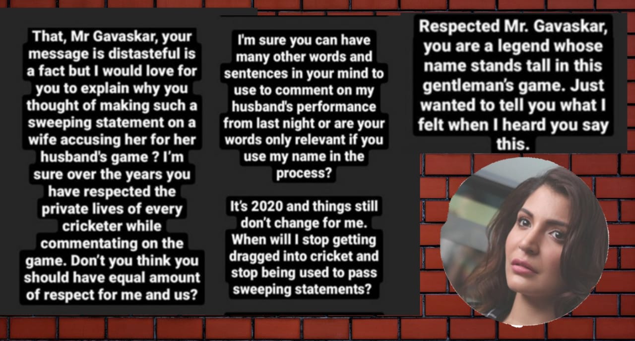 শুক্রবার মুখ খুললেন বিরাটের স্ত্রী অনুষ্কা শর্মা ইনস্টাগ্রামে লিখেছেন, “মিস্টার গাভাসকর আপনার মন্তব্য অত্যন্ত কুরুচিকর। আমি আপনার কাছে জানতে চাই, স্বামীর খেলার জন্য স্ত্রীকে দায়ী করার মতো ভাবনা আপনি কী করে ভাবলেন? আমি নিশ্চিত, ক্রিকেট ধারাভাষ্যের সময় আপনি প্রত্যেক ক্রিকেটারের ব্যক্তিগত জীবনকে চিরকাল সম্মানই করে এসেছেন।’’