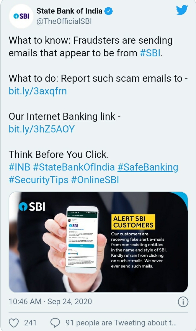 বৃহস্পতিবার স্টেট ব্যাঙ্কের তরফে একটি সতর্কতামূলক টুইট করা হয়। তাতে জানানো হয়, স্টেট ব্যাংকের নাম করে ফেক ইমেল পাঠানো হচ্ছে গ্রাহকদের। ব্যাঙ্ক কোনও ইমেল পাঠাচ্ছে না। ব্যাঙ্কের নাম দিয়ে কোনও ইমেল আসলে, সেটিকে খুলতে বারণ করা হয়েছে স্টেট ব্যাঙ্কের তরফে।