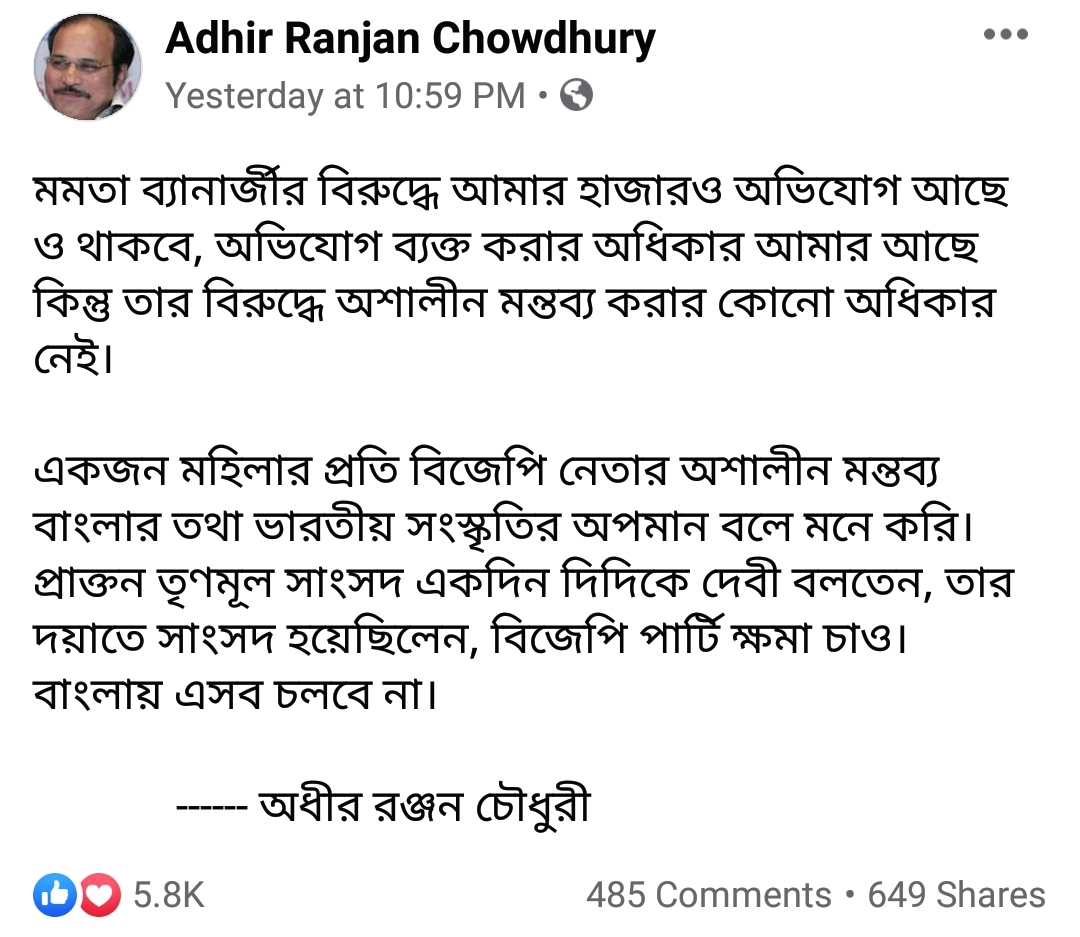 এ প্রসঙ্গে অধীর চৌধুরী তাঁর ফেসবুকে একটি পোস্ট করেছেন। সেখানে তিনি বলেন, “মমতা ব্যানার্জীর বিরুদ্ধে আমার হাজারও অভিযোগ আছে ও থাকবে, অভিযোগ ব্যক্ত করার অধিকার আমার আছে কিন্তু তার বিরুদ্ধে অশালীন মন্তব্য করার কোনও অধিকার নেই। একজন মহিলার প্রতি বিজেপি নেতার অশালীন মন্তব্য বাংলার তথা ভারতীয় সংস্কৃতির অপমান বলে মনে করি। প্রাক্তন তৃণমূল সাংসদ একদিন দিদিকে দেবী বলতেন, তার দয়াতে সাংসদ হয়েছিলেন, বিজেপি পার্টি ক্ষমা চাও। বাংলায় এসব চলবে না।”