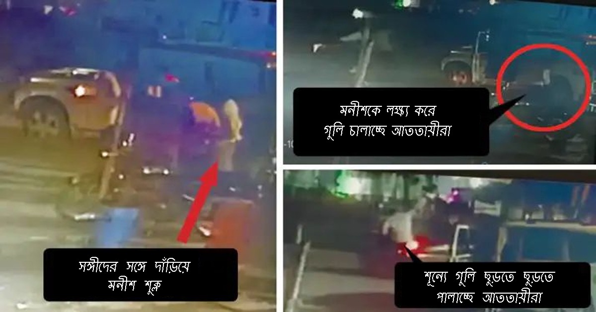 রবিবার রাতে বারাকপুরের বিজেপি নেতা মণীশ শুক্লর খুনের পর একটি সিসিটিভি ফুটেজ প্রকাশ্যে এসেছে। ওই ফুটেজে দেখা গেছে, ঘটনাস্থলে চায়ের দোকানের সামনে সঙ্গীদের নিয়ে দাঁড়িয়ে রয়েছেন মণীশ। তাঁর পাশেই তাঁর স্করপিও গাড়িটি বিটি রোডের ওপর দাঁড় করানো। গাড়ির বাঁ দিকের সামনের দরজা খোলা ছিল। বাঁ দিকের ইন্ডিকেটর ল্যাম্প জ্বলছিল। গাড়ির দিকে পেছন করে দাঁড়িয়ে কথা বলছিলেন মণীশ। ঠিক সেই সময়েই মণীশের গাড়ি পেরিয়ে তাঁর মুখোমুখি চলে আসে একটি বাইক। বাইকে দু’জন বসা। বাইকের পিছনে বসা যুবক মণীশ ও তাঁর সঙ্গীদের লক্ষ্য করে গুলি চালাতে শুরু করে। আর তাতেই হতচকিত হয়ে যান মনীশের সঙ্গীরা। ঘটনার জেরে সেই সময় গাড়ির দরজার আড়ালে মাটিতে পড়ে যান মণীশ। আতঙ্কে চারদিকে সকলে ছুটতে শুরু করেন।