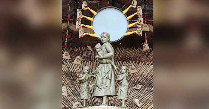 শিশুসন্তান কোলে এক পরিযায়ী মা–কে শিশু কার্তিক কোলে দেবীর রূপে ভেবেছেন সরকারি আর্ট অ্যান্ড ক্রাফ্ট কলেজের দুই প্রাক্তন ছাত্র রিন্টু দাস এবং পল্লব ভৌমিক। প্রতিমা, মন্ডপের মূল ভাবনা রিন্টুর। আর ফাইবার গ্লাসে সেই প্রতিমা গড়েছেন পল্লব। প্যাঁচা কোলে লক্ষ্মী এবং হাঁস কোলে সরস্বতীর রূপেও রয়েছে পরিযায়ী শ্রমিক সন্তানদের ছায়া। থাকছে গণেশের মূর্তিও। চারজনকে নিয়ে ওই পরিযায়ী মা হেঁটে যাচ্ছেন দেবী দুর্গা প্রতিকৃতি রূপ দশভুজার।