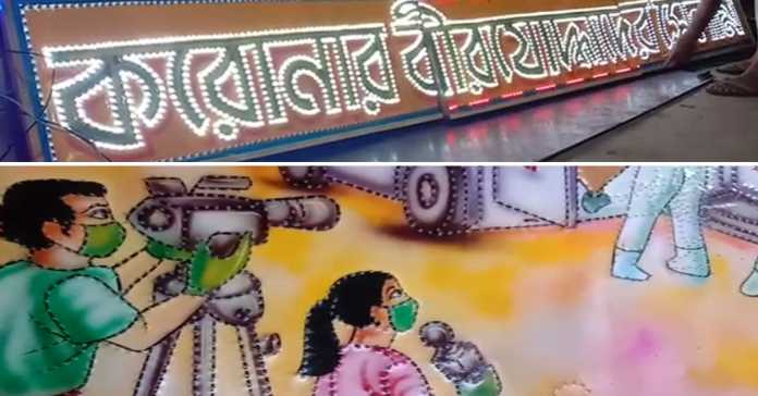ভয়াবহ অতিমারি করোনার সঙ্গে লড়াই করছে গোটা বিশ্ব। ভ্যাকসিন নেই, ফলে লড়াইয়ের একমাত্র রাস্তা সচেতনতা। দেশ তথা পৃথিবীর ভয়াবহ এই বিপদে সামনের সারিতে দাঁড়িয়ে লড়াই করছেন কিছু মানুষ। যে তালিকা সর্বাগ্রে রয়েছেন ডাক্তার, স্বাস্থ্যকর্মী, পুলিশ, সাংবাদিকরা। তাদের সম্মান জানিয়েই এবার সময়ের সঙ্গে তাল মিলিয়ে অভিনব ভাবনায় পা মেলাল চন্দননগর। আলোক প্রদর্শনীর মাধ্যমেই মানুষের মধ্যে সচেতনতার বীজ বপন করতে এগিয়ে এল তারা। এবার চন্দননগরের করোনা সচেতনতামূলক আলোকসজ্জা প্রদর্শিত হতে চলেছে শহরের বেশ কয়েকটি পুজো মণ্ডপে। তার মধ্যে অন্যতম শ্রীভূমি স্পোর্টিং ক্লাব।