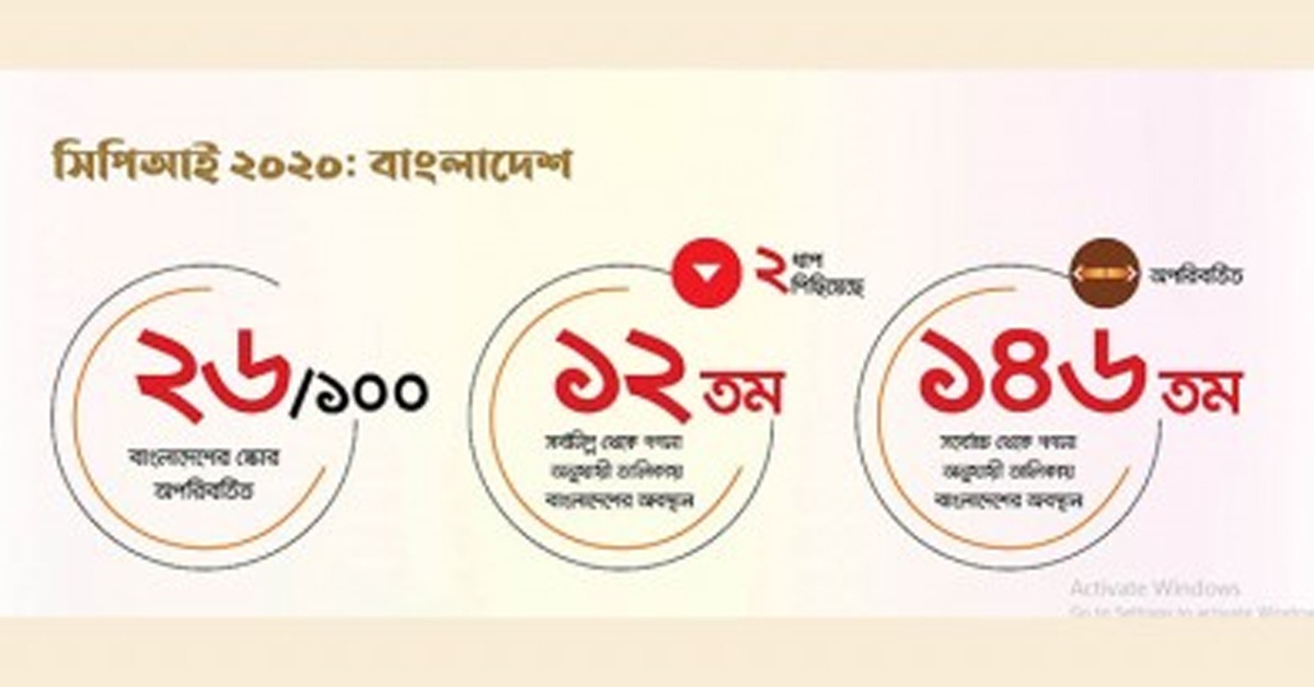 দুর্নীতির ধারণা সূচকে (করাপশন পারসেপশন ইনডেক্স-সিপিআই ২০২০) বাংলাদেশের স্কোর ২৬।