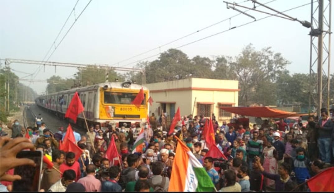 ট্রেন অবরোধে সামিল বাম পরিষদীয় দলের নেতা সুজন চক্রবর্তী ও বাম সমর্থক ধর্মঘটীরা। কার্যত আপ ও ডাউন ট্রেনের উপর উঠে পড়েন তাঁরা। এদিন সকালে যাদবপুর ৮বি বাসস্ট্যান্ড থেকে শুরু হয় সিপিএমের মিছিল। মিছিল এগিয়ে যায় স্টেশনের দিকে। কর্মী-সমর্থকরা ট্রেন স্টেশনে থামলে নেমে পড়ে লাইনে।