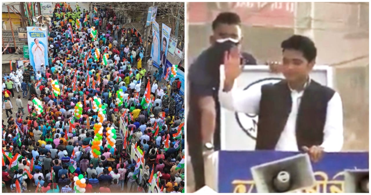 বিকেল ৪টে। দূরত্ব ৪ কিলোমিটার। কামালগাজি থেকে সোনারপুর৷ কুলপির সভা শেষ করে দ্রুত চলে আসেন অভিষেক। শুরু হয় পদযাত্রা। মূলত জনসংযোগযাত্রা। রাস্তার দুধারে সাদা-নীল, জাতীয় পতাকার রঙের বেলুন। বাসের গায়ে একাধিক মণীষীর ছবি। একের পর এক গেট। তাতে লেখা ঐতিহাসিক মহামিছিল। রাস্তার দু’ধারে অসংখ্য ফ্লেক্স, নেত্রী আর অভিষেকের ছবি। মানুষের হর্ষধ্বনী, কেউ কেউ ফুলও ছুড়লেন। দু’পাশের বাড়িগুলি থেকে উৎসাহী মানুষ হাত নাড়লেন। আপ্লুত মানুষ। খুশি তৃণমূলকর্মী। সব মিলিয়ে রঙিন মিছিল। দক্ষিণ ২৪ পরগণার মানুষ এর আগে এমন জনসমুদ্র, এমন প্রাণবন্ত মিছিল দেখেননি।