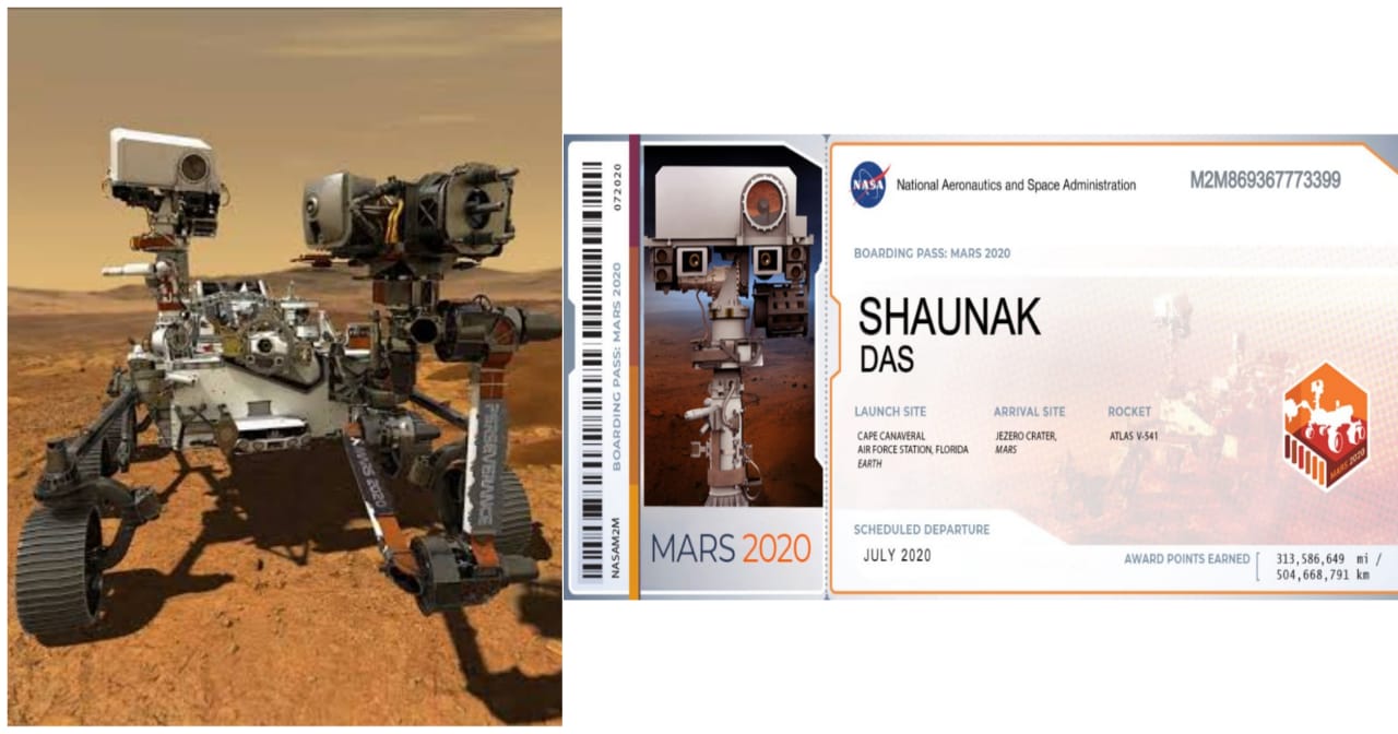 মহাকাশ গবেষণা সংস্থা নাসার ‘মার্স ২০২০'(Mars 2020) মিশন আনুষ্ঠানিকভাবে ঘোষণার পর গোটা বিশ্ববাসীকে এই মিশনের সঙ্গে যুক্ত করতে এক অভিনব পদক্ষেপ নেয় নাসা(NASA)। সংস্থার তরফে একটি ওয়েবসাইটে অনলাইন রেজিস্ট্রেশনের মাধ্যমে অংশ নিতে বলা হয়। ওই ওয়েবসাইটে রেজিস্ট্রেশন করলে প্রত্যেককে দেওয়া হয় ‘মার্স ২০২০’ মিশনের একটি বোর্ডিং পাস(Boarding pass)। পাশাপাশি সংস্থা এটাও জানায়, যারা যারা এই বোর্ডিং পাস পাবে তাদের প্রত্যেকের নাম একটি মাইক্রোচিপের মাধ্যমে পাঠানো হবে নাসার মহাকাশযানে। সেভাবেই সারা পৃথিবী থেকে ১,০৯,৩২,২৯৫ জনের নাম মাইক্রোচিপে পাঠানো হয়। এই তালিকাতেই রয়েছেন শ্রীরামপুরের বাসিন্দা শৌনক দাস, কলকাতার সুপর্ণা দে, অভিজিৎ পাত্র সহ আরও অনেকে। স্বাভাবিকভাবেই নাসার এই সফল অভিযানে খুশিতে সেই সমস্ত ব্যক্তিরা যারা এই কর্মকাণ্ডে অংশ নিয়েছিলেন।