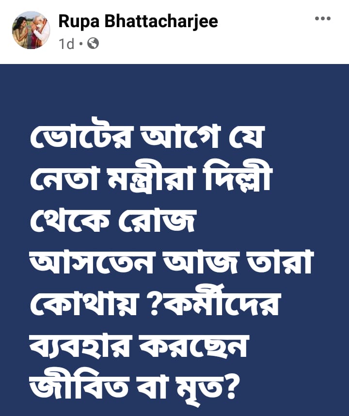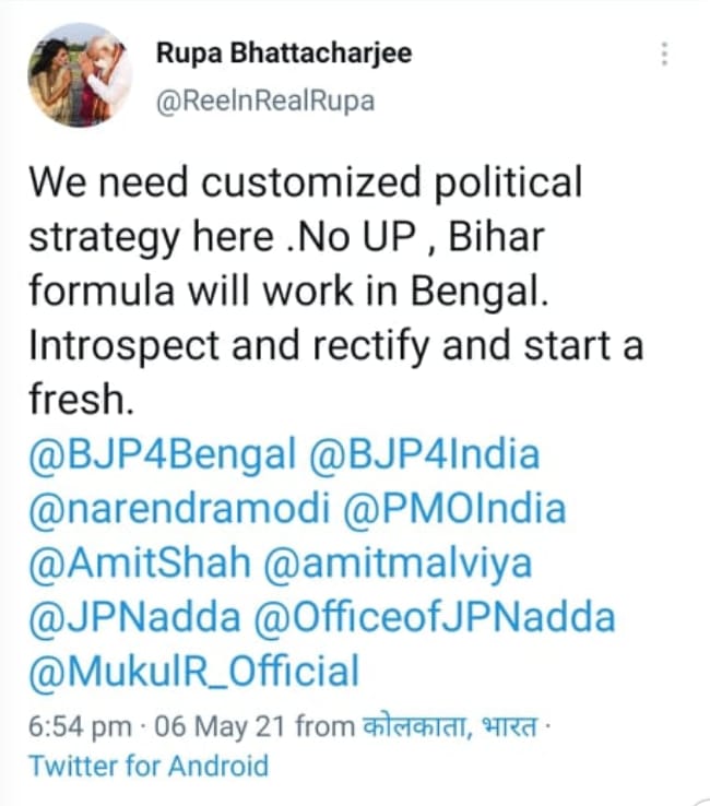 বাংলার ভোটে বিজেপি’র এই ফলের জন্য দলের নেতাদের ভূমিকার কড়া সমালোচনা করে রূপা লিখেছেন, “ভোটের আগে যে নেতা মন্ত্রীরা দিল্লী থেকে রোজ আসতেন আজ তারা কোথায় ?কর্মীদের ব্যবহার করছেন জীবিত বা মৃত?আপনাদের তেল মেরে বরাবর নিজেদের আখের গুছিয়েছে এখানকার কিছু নেতা।আর মরেছে কর্মীরা।যারা নিজের কর্মীদের পাশে থাকে না তারা মানুষের পাশে থাকবে? কর্মীরা আর আপনাদের বিশ্বাস করবে তো??”