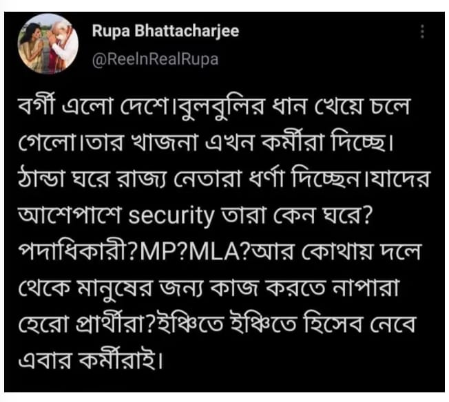পরের পোস্টে লিখেছেন, “বর্গী এলো দেশে।বুলবুলির ধান খেয়ে চলে গেলো।তার খাজনা এখন কর্মীরা দিচ্ছে। ঠান্ডা ঘরে রাজ্য নেতারা ধর্ণা দিচ্ছেন। যাদের আশেপাশে security তারা কেন ঘরে? পদাধিকারী?MP? MLA? আর কোথায় দলে থেকে মানুষের জন্য কাজ করতে না-পারা হেরো প্রার্থীরা? ইঞ্চিতে ইঞ্চিতে হিসেব নেবে এবার কর্মীরাই।”
