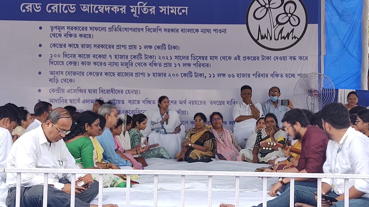 কেন্দ্রীয় বঞ্চনা, কেন্দ্রীয় এজেন্সির অপব্যবহার সহ একাধিক ইস্যুতে রেড রোডে গতকাল, বুধবার থেকে ধর্নায় বসেছেন তৃণমূল নেত্রী মমতা বন্দ্যোপাধ্যায়। আজ, বৃহস্পতিবার দ্বিতীয় দিনে সেই ধর্না মঞ্চে যোগ দেয় যাদবপুর, প্রেসিডেন্সি, কলকাতা বিশ্ববিদ্যালয়ে পড়ুয়ারা। টানা ৩০ ঘণ্টা ধরে আম্বেদকরের মূর্তির পাদদেশে কেন্দ্রের মোদি সরকারের অপশাসনের বিরুদ্ধে ধর্না করছেন তৃণমূল কংগ্রেস সুপ্রিমো। চলবে আজ, বৃহস্পতিবার সন্ধ্যা ৭টা পর্যন্ত।