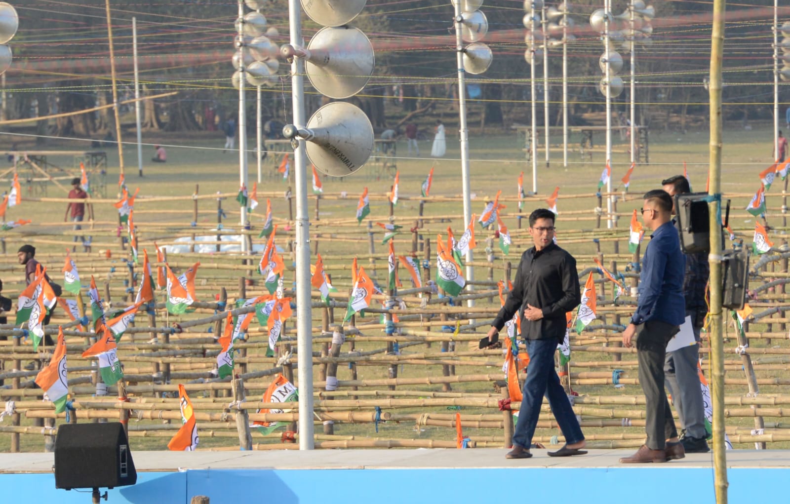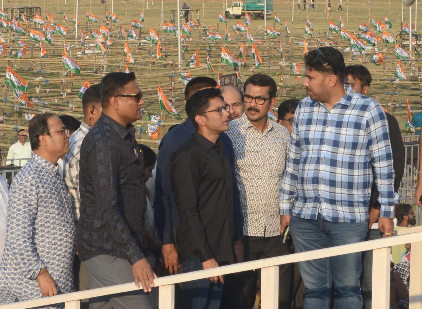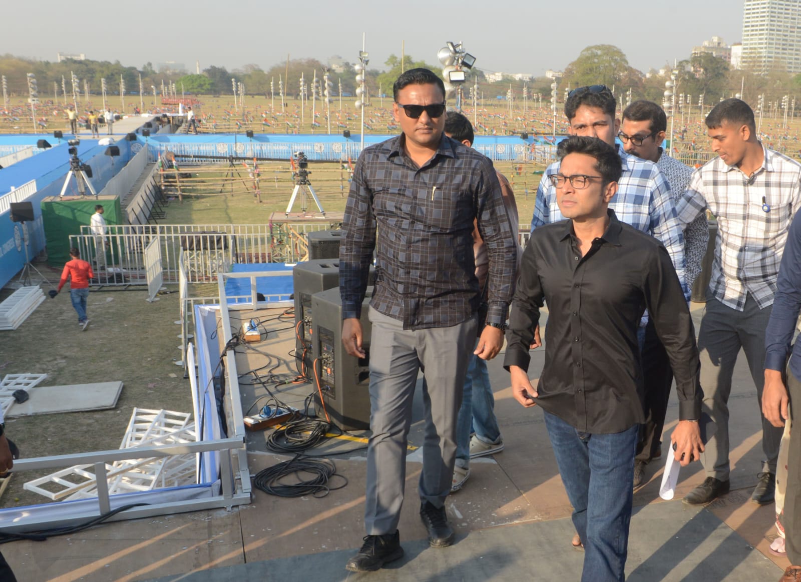 রবিবার ব্রিগেডে ঐতিহাসিক তৃণমূলের ‘জনগর্জন’ সভা। চলছে শেষ মুহূর্তের প্রস্তুতি। শনিবার, বিকেল সাড়ে চারটে নাগাদ সভার প্রস্তুতি খতিয়ে দেখতে ব্রিগেডে যান তৃণমূলের (TMC) সর্বভারতীয় সাধারণ সম্পাদক অভিষেক বন্দ্যোপাধ্যায় (Abhishek Banerjee)। বেশ খানিকক্ষণ সভার মূল মঞ্চের খুঁটিনাটি খতিয়ে দেখেন। ঘুরে দেখেন অন্যান্য মঞ্চও। একসময় মাইক হাতে তুলে নেন। দেন “জয় বাংলা” স্লোগান। নেতা-কর্মীদের বলেন, “আগামিকাল দেখা হবে।“ দলের সেনাপতির ভোকাল টনিকে আরও উজ্জীবিত কর্মীরা।